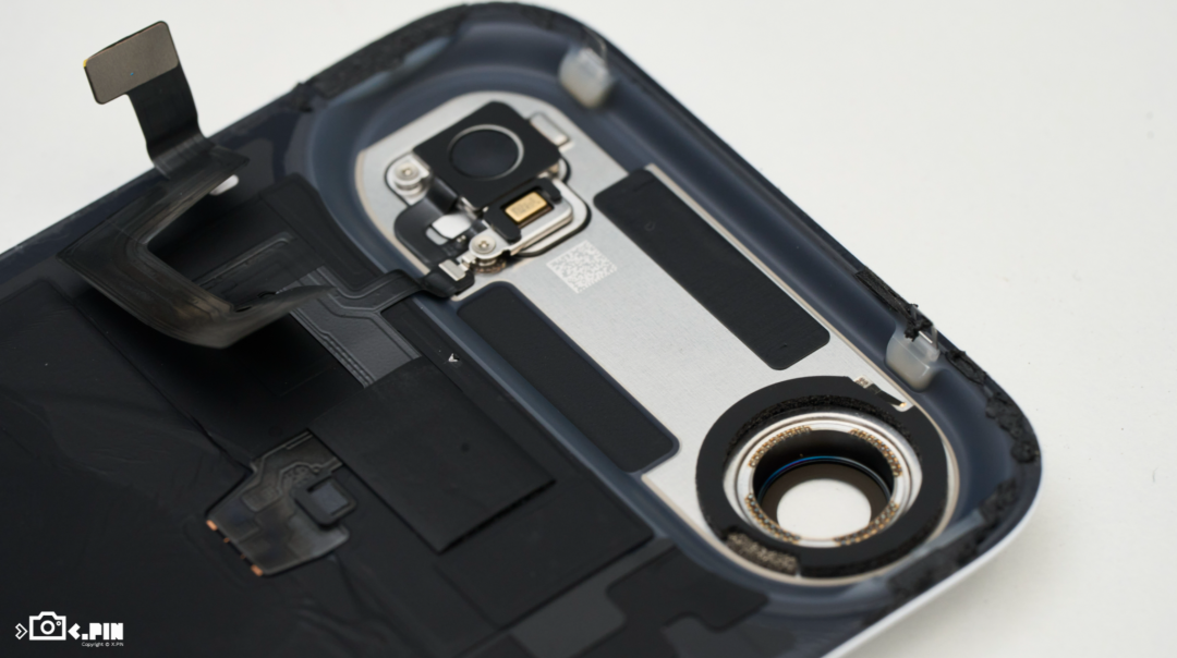 由于掏空后结构强度会有所下降,并且这个拓展平台又是这块玻璃盖板中最容易被摔碎的区域,所以苹果的做法就是,给这个平台的四周都给打上点胶,然后再通过一块金属片来进行加固。