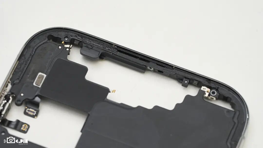 从整体的排布结构来看,iPhone Air和17 Pro一样,都用了类似安卓这边的三段式布局,主板变成了横向排布,并且进行上移,整个机身由上到下,分别是主板/摄像头、电池、马达和麦克风等周边零部件。