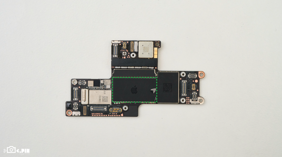 苹果在内部把这个拓展平台给掏了一块空间出来,用来容纳摄像头、扬声器以及主板的双层叠板部分。