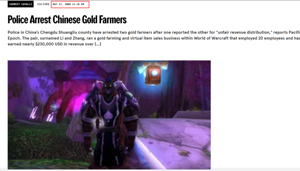 2008年5月,中国四川省成都市双流县警方突击查处了一家从事《魔兽世界》金币交易的非法“金农”作坊,并逮捕了两名主要负责人李某与张某。据报道,他们在约七个月的时间里雇佣约二十名员工,专门通过游戏角色刷取金币和虚拟物品,再转卖给第三方获利,该业务在短短数月内就获得约23万美元(约合人民币160万元)的收入。