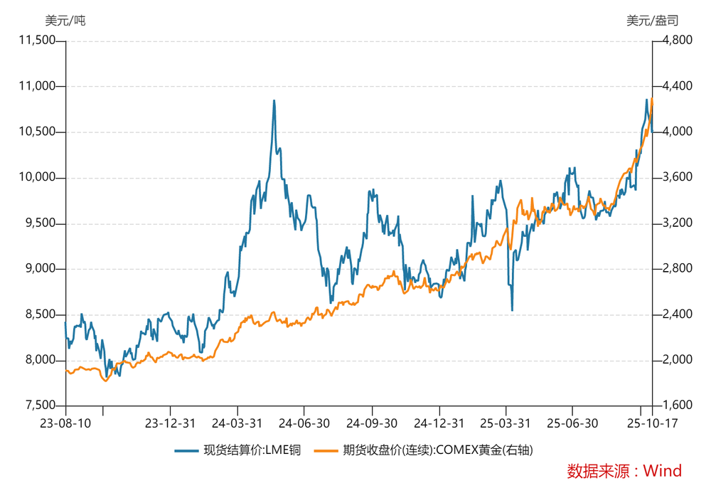 铜更是宏观经济风向标。按照传统逻辑,黄金与铜往往呈现相反的走势:市场预期经济好时,铜涨金跌;市场预期经济衰退时,金涨铜跌。
