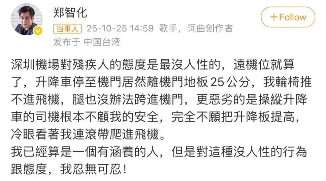 拄着拐杖慷慨唱着“他说风雨中这点痛算什么”的郑智化,在深圳机场经历了新的痛。