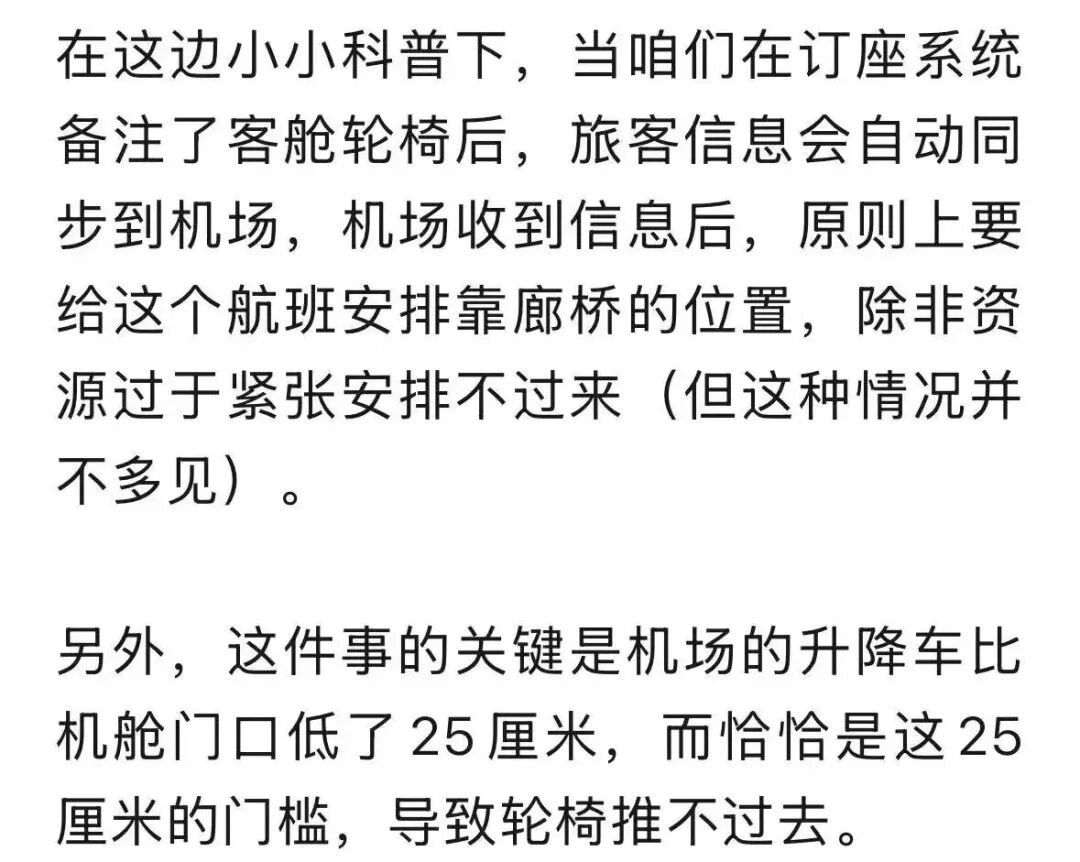 但专业人士有话说,航空从业人员,航空博主@候机楼一姐 科普说,首先飞机上有残疾人应该安排廊桥登机,其次,飞机舱门的落差可以加装斜坡来协助轮椅通过。深圳机场挨骂不冤。