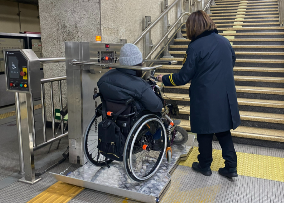 但我有一次亲眼看见这个设施的“不同用法”。当时我进站往下走,看见两位地铁工作人员和两个乘客,其中一位乘客是坐着轮椅的老人,另一位是家属。家属正在发问:“这不是有无障碍设施吗?”