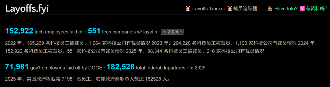 独立裁员跟踪网站Layoffs.fyi的统计显示,2024年全球科技行业裁员人数超过15万。
