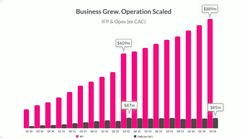 业务流程高度自动化使得Lemonade的运营开支连续九个季度没有增长,同时还能实现业务持续扩张。例如,从2021年到2024年,其保费规模增长了2.3倍,但员工人数仅增加了2%,这一效率远超行业顶尖的传统保险公司。