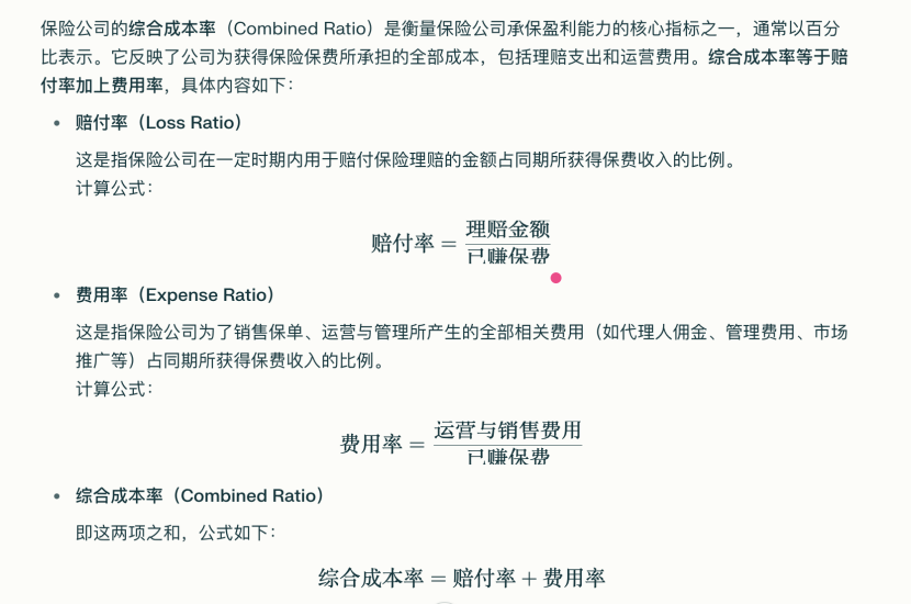 关于综合成本率(=赔付率+费用率)的解释,来自perplexity