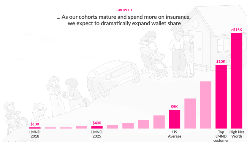 Lemonade 70%的客户年龄在35岁以下,随着他们人生轨迹的推进(买车、买房),Lemonade将依托强大的数字化定价和直销渠道,通过交叉销售和向上销售,把保费更昂贵的房屋险和车险卖给这些客户。