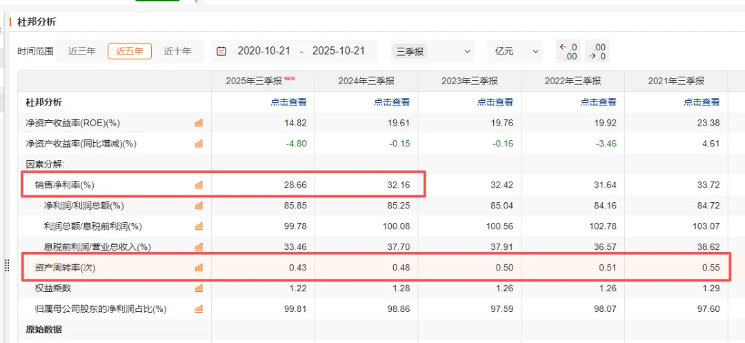 用杜邦分析法拆解,片仔癀ROE下滑问题出在两头:销售净利率下滑、资产周转率放缓。用大白话来说,就是“卖得不好、赚得少”。