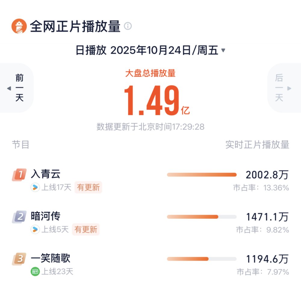 前有爱奇艺《一笑随歌》先声夺人,灯塔全网正片播放量连续12天稳居榜单亚军;后有优酷《入青云》后来者居上,全网正片播放量逆袭至冠军。两军战火硝烟未散,优酷的新剧《暗河传》又加入战局。