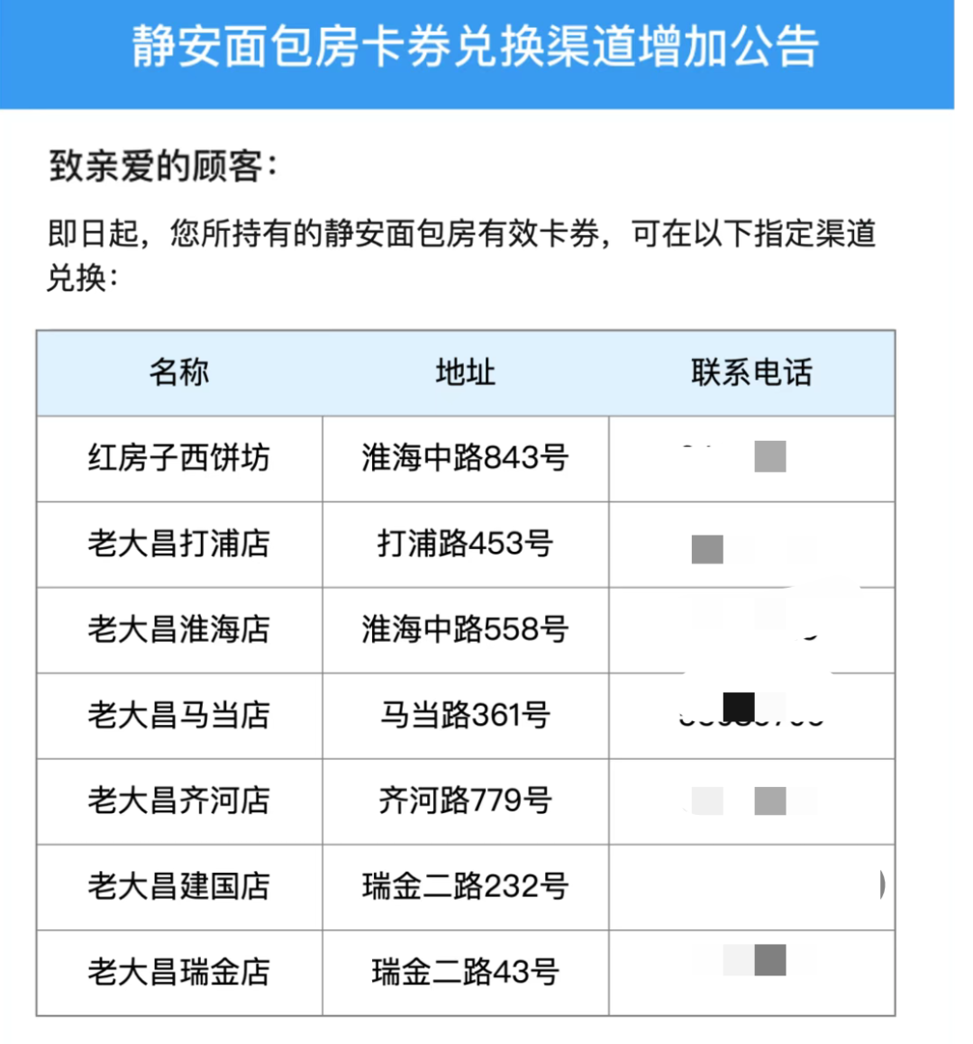 10月25日晚,静安面包房官方微信发布公告称,消费者所持有的静安面包房有效卡券,除了能在静安面包房在营门店兑换外,还可在红房子西饼坊、老大昌等7家门店兑换。