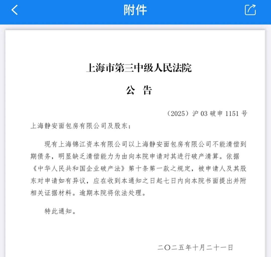 与此同时,上海市第三中级人民法院公告显示,其母公司上海锦江资本有限公司以静安面包房“不能清偿到期债务,明显缺乏清偿能力”为由,向法院申请破产清算,法院已于2025年10月21日启动法律程序。