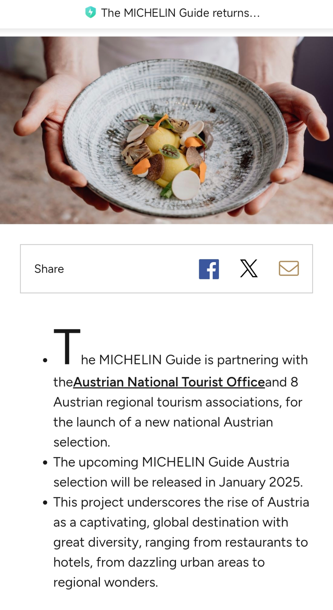 上图为米其林指南官方发布的,宣布与奥地利地区合作的消息界面。