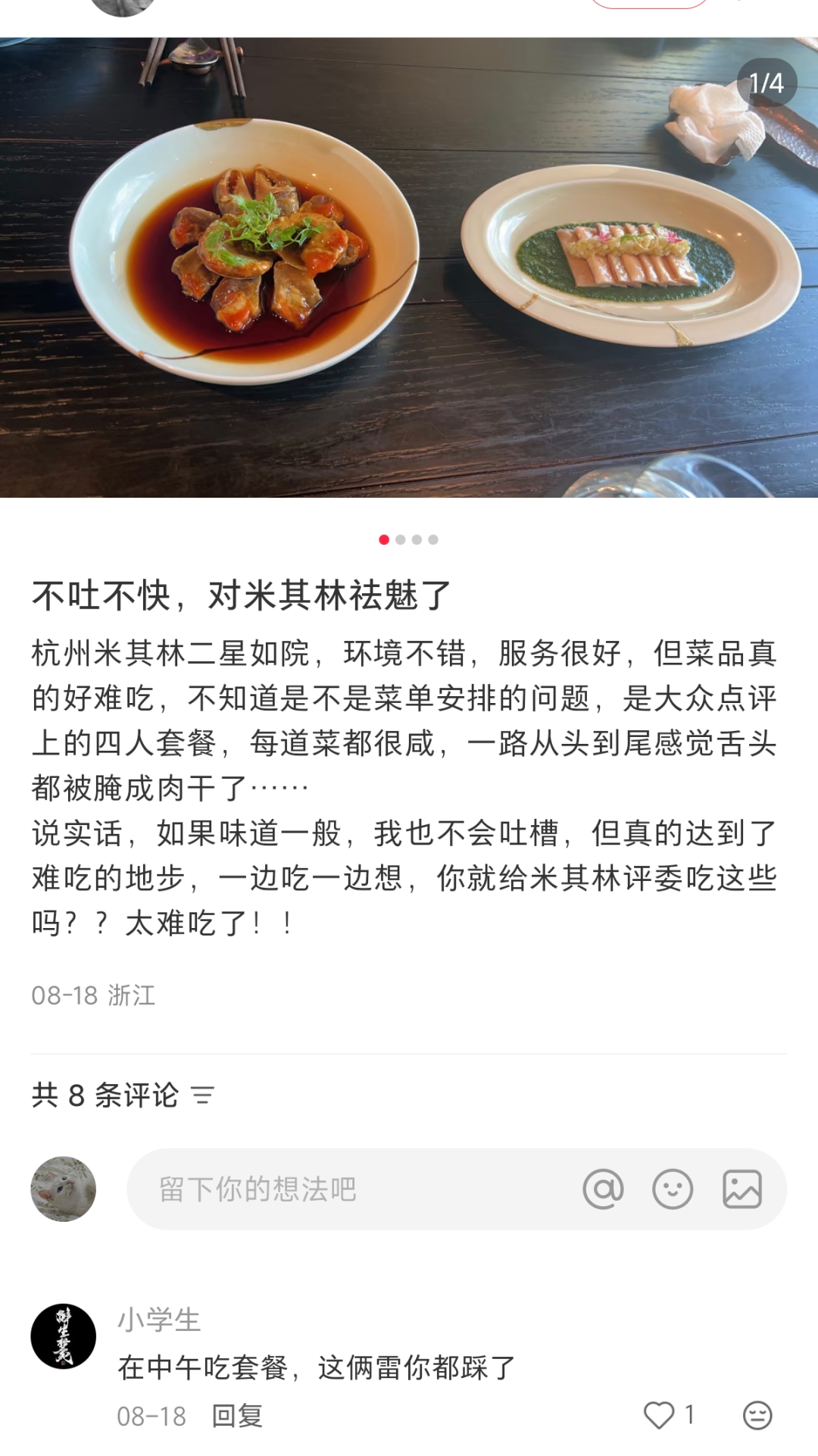 有人觉得,米其林的“正统感”与中国饮食的“人情味”与“烟火气”并不兼容;也有许多帖子评价米其林餐厅不好吃、不合口味、像在演戏;有人说:“大部分米其林餐厅都只有几个套餐可以选,不能单点,选好后就像流水线一样上菜”;有餐饮业内人士指出:“被选上的餐厅并非城市中最具代表性的味道,而是最接近国际评审口味的那一类。”