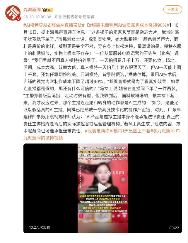 这种现象就有点像是电商领域的过度美化。不久前微博上的话题 #AI模特穿AI衣服做AI直播带货,也是类似的问题。消费者看直播,就是为了更立体全面地观察衣服的上身效果——用AI做直播,看直播还有什么意义?