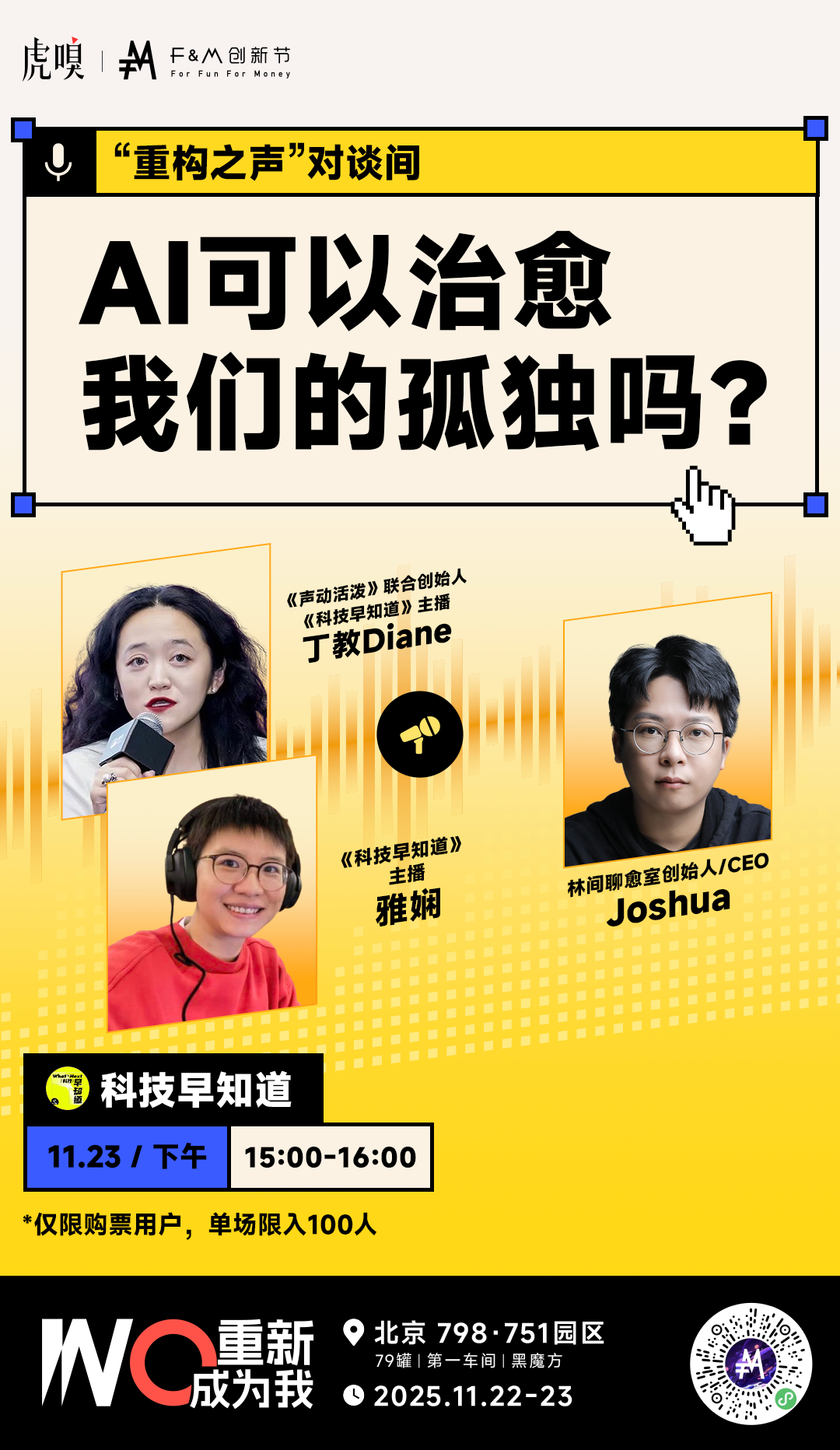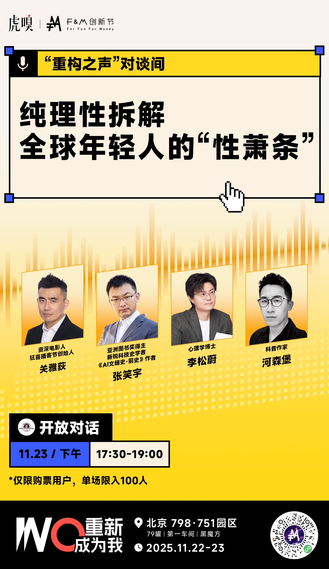 11月22日-23日,在虎嗅F&M创新节的「黑魔方」对谈间,我们将直面这一代人的情感转向。资深电影人关雅荻将与心理学博士李松蔚、科普作家河森堡、亚洲图书奖得主、新锐科技史学者、《AI文明史·前史》作者张笑宇展开一场《开放对话》,不设禁忌、不贴标签,坦诚探讨亲密关系背后的心理图景、社会结构与自我真实。