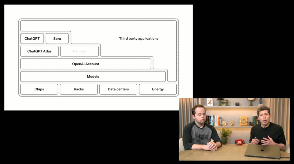 底层是芯片、机架、数据中心和能源系统;中间是模型训练和账户体系;再往上,是他们自己的浏览器“Atlas”,以及未来几年会推出的硬件设备。