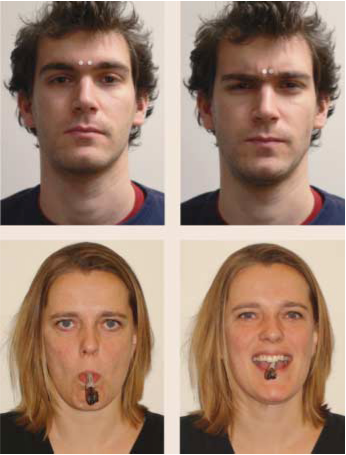 实验表明,人们的面部表情会影响人们对于事物有趣度的情绪认知。在实验中,被试需要用嘴巴横着含住一支笔并观看动画片。当被试横着含笔时,嘴巴会自然做出微笑的表情,而当被试竖着含笔时,会做出严肃嘟嘴的表情(下图)。
