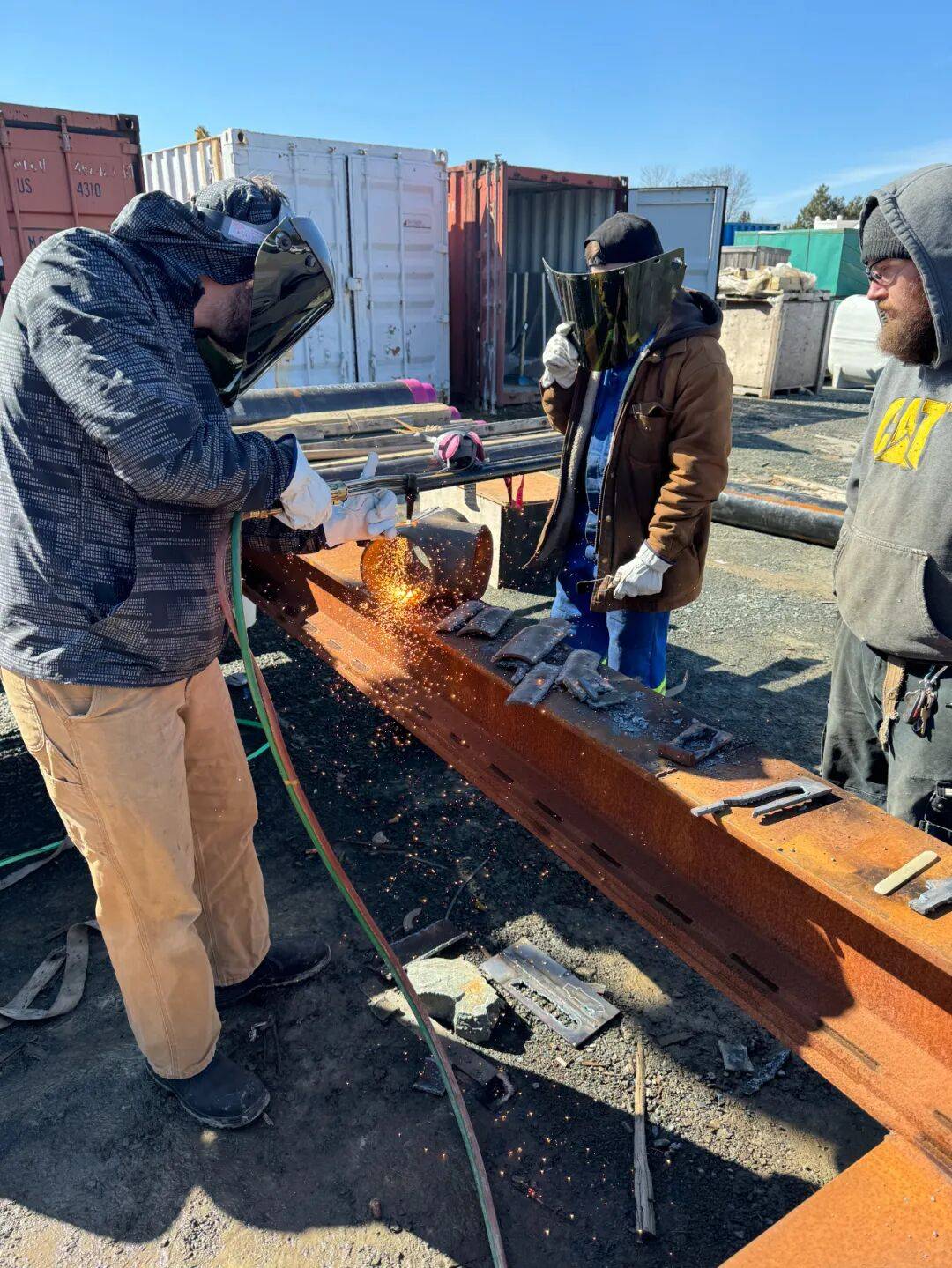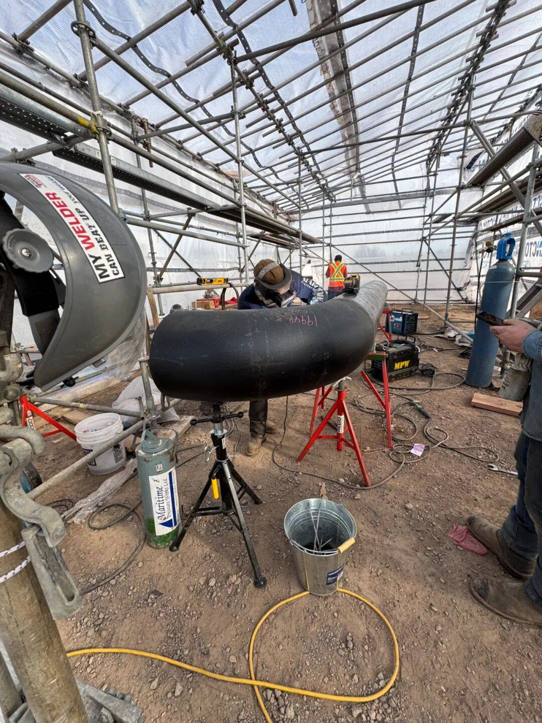 • 与焊工(Welder)协作:管道工(Pipe Fitter)和焊工(Welder)的工作是搭档协作的关系。管道工的职责是“指挥官”:我们负责阅读图纸、精确地排列和对准(Line Up)管子,并点出焊接的位置。焊工的职责是“执行者”:他只需要按照我们划定的位置进行焊接。如果管子连接错误,责任完全由管道工承担。在一个纯粹的管道公司里,管道工与焊工的比例大约是1:3,因为许多焊工也能处理简单的管道工作。这点可以看出,在我们的行当里,焊工在某种程度上比管道工更吃香一些,也更容易找到工作。