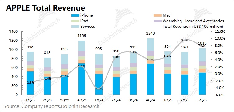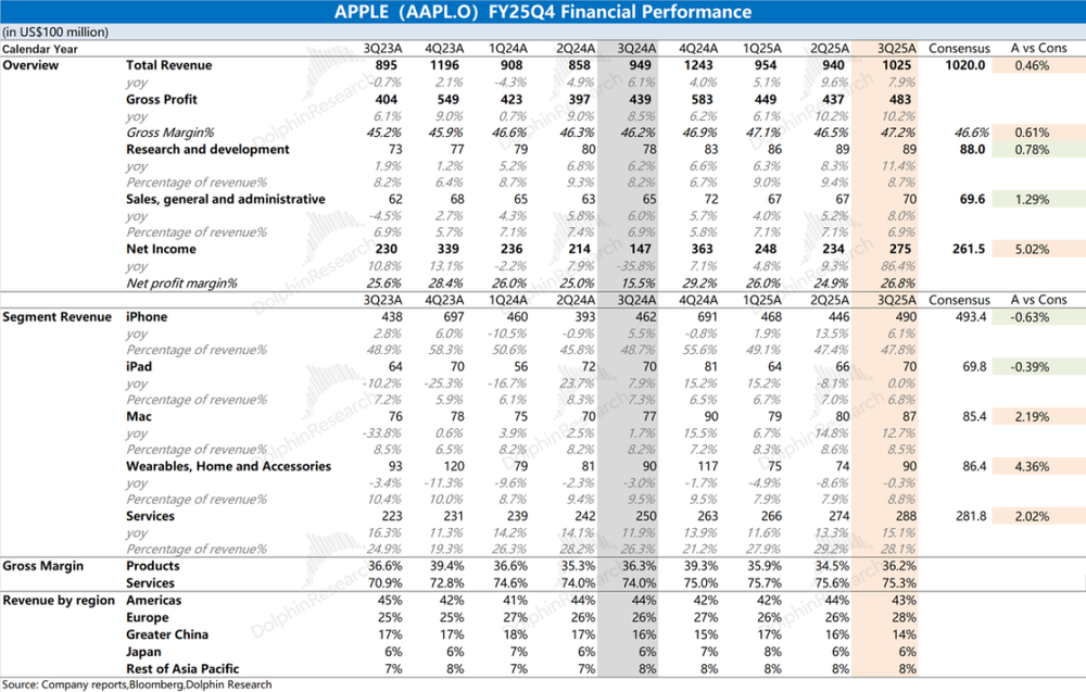 1.1 收入端:2025财年第四季度(即3Q25)苹果公司实现营收1025亿美元,同比增长7.9%,符合市场一致预期(1020亿美元)。公司本季度收入端的提升,主要受益于iPhone、Mac和软件服务业务增长的带动,而iPad和可穿戴等其他硬件业务表现仍相对较弱。