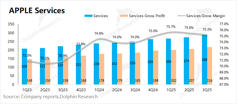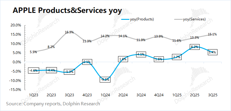 2025财年第四季度(即3Q25)软件服务收入288亿美元,同比增长15.1%,市场一致预期(282亿美元)。即使在美国App Store允许外部链接的情况下,苹果软件服务收入增长仍有所提速,体现了苹果软件生态的壁垒。