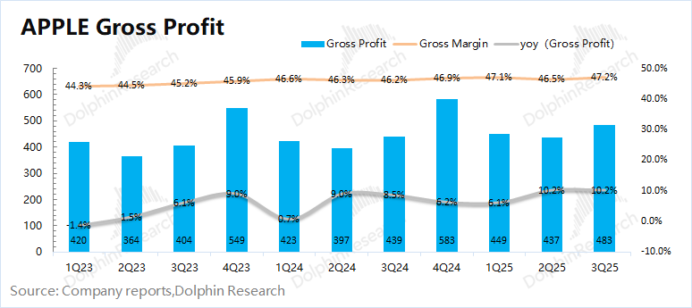 1.2 毛利率:2025财年第四季度(即3Q25)苹果公司毛利率47.2%,同比增加1pct,市场一致预期(46.6%)。公司毛利率的提升,主要是受软件业务毛利率提升以及结构性的带动。