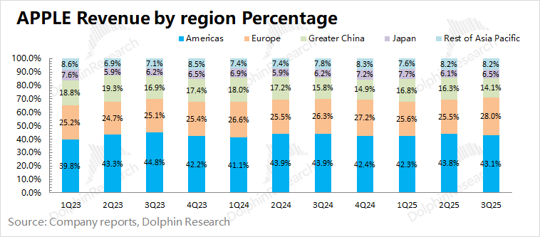 具体来看,美洲地区的收入占比达到43.1%,本季度增长6.1%;欧洲地区本季度增速提升至15.2%。受iPhone Air发布推迟等因素影响,大中华区的收入在本季度同比下滑3.6%,是唯一下滑的地区,公司预计下季度恢复增长。