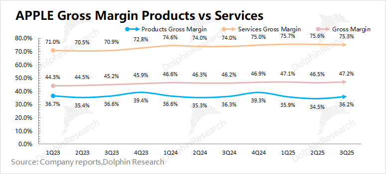 苹果公司本季度软件毛利率维持在75.3%的相对高位,是本季度公司毛利率提升的主要来源。而硬件端的毛利率维持在36.2%,其中本季度关税相关成本影响大约在11亿美元。若剔除该影响,公司本季度硬件端毛利率约为37.7%,实际上应该是同比提升1.4pct。