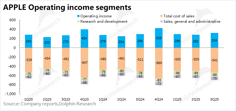 1.3 经营利润:2025财年第四季度(即3Q25)苹果公司经营利润324亿美元,同比增长9.6%。苹果公司本季度经营利润的增长,是受收入增长和毛利率提升的共同带动。
