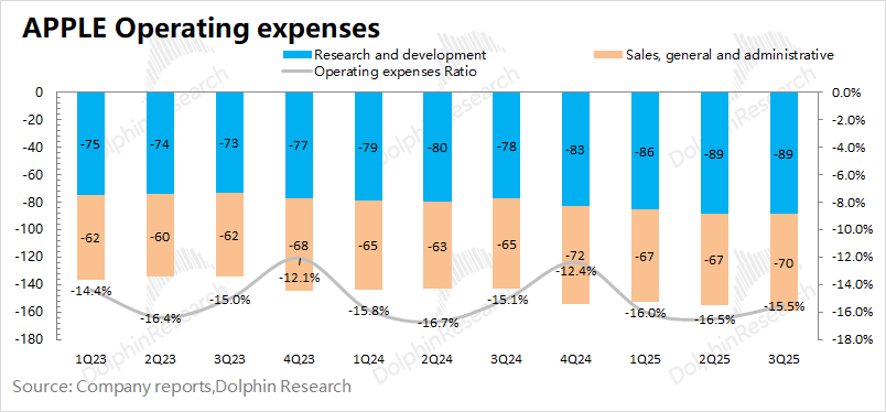 本季度苹果公司的经营费用率为15.5%,同比下降0.4pct。公司销售和行政费用保持稳定,这个季度多增的支出也主要体现在研发支出中。