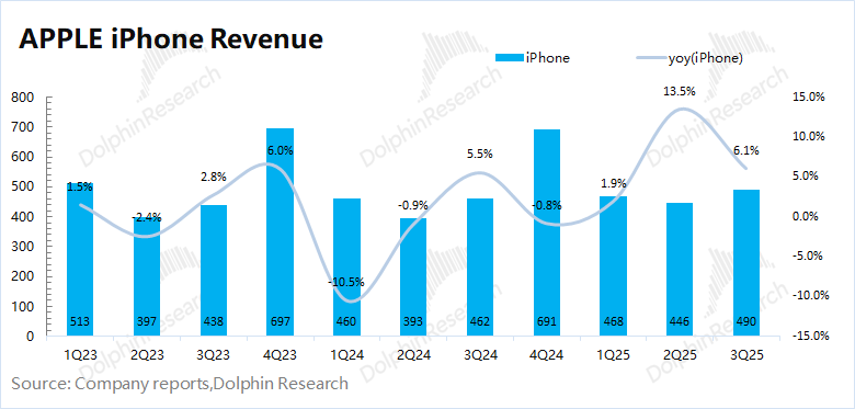 2025财年第四季度(即3Q25)iPhone 业务收入490亿美元,同比增长6.1%,略低于市场预期(493亿美元)。公司iPhone业务本季度的增长,主要得益于iPhone17系列新品以及新兴市场需求增长的带动。