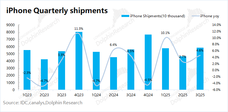 1)iPhone 出货量:根据IDC的数据,2025年第三季度全球智能手机市场同比增长2%。苹果本季度全球出货量同比增长4.6%左右,公司的出货量表现略好于整体市场。