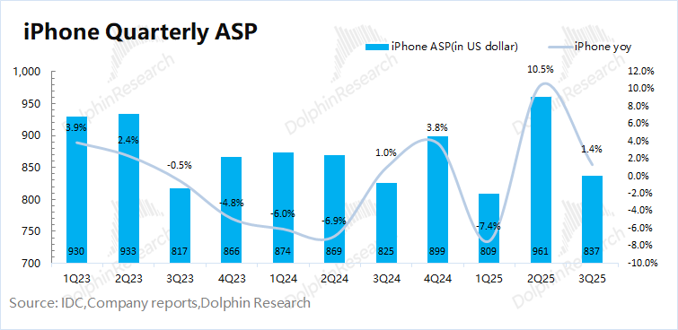2、iPhone:本季度公司iPhone业务实现营收490亿美元,同比增长6.1%,略低于市场预期(493亿美元)。本季度手机业务的增长,受iPhone17系列新品发布的推动。对于本季度,海豚君估算iPhone整体出货量同比增长4.6%,出货均价同比上涨1.4%。