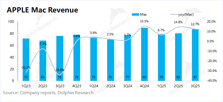 2025财年第四季度(即3Q25)Mac 业务收入87亿美元,同比增长12.7%,略好于市场预期(85亿美元)。