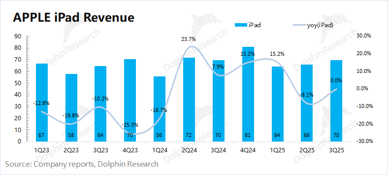 2025财年第四季度(即3Q25)iPad 业务收入70亿美元,同比持平,市场一致预期(70亿美元),由于去年iPad Air/Pro的发布导致基数较高。