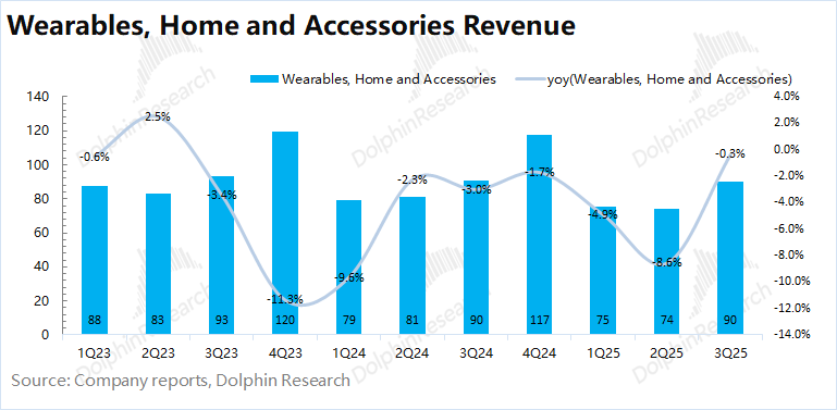 2025财年第四季度(即3Q25)可穿戴等其他硬件业务收入90亿美元,同比下滑0.3%,好于市场预期(86.4亿美元)。可穿戴及其他业务,在本季度基本止住了连续九个季度的下滑。