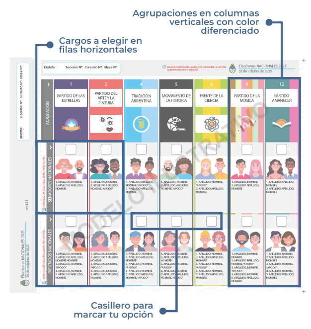 2023年前,阿根廷沿袭了一种从普遍文盲时代继承下来的古老的选票制度:每个政党自己印刷投给自己的选票(即政党选票Boleta partidaria,在阿根廷,必须依法印成经批准的自己政党独一无二的代表色)放在各投票站。这些选票花花绿绿、各自不同,很像贴电线杆的小广告,选民进入投票站后,自己取一种想要的投入票箱。