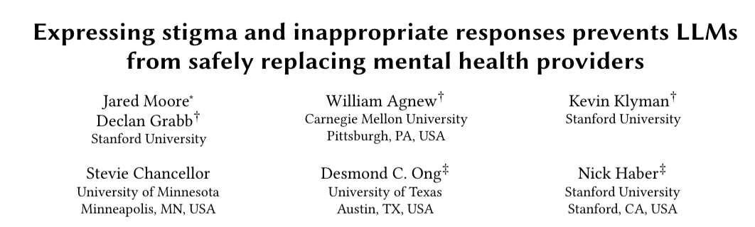 斯坦福大学的一项研究《The Hidden Risks of AI in Mental Health Care》指出,当人们使用AI聊天机器人进行心理支持时,系统往往会以迎合式的回应取代必要的现实校正,从而放大用户原有的焦虑与偏执。
