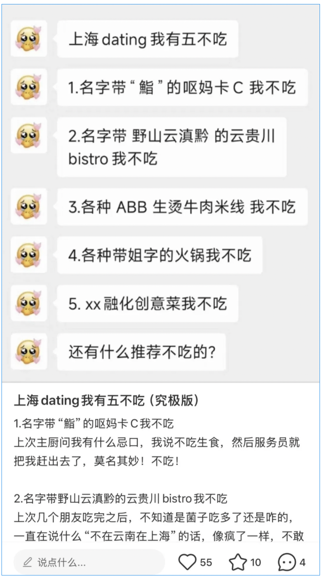 社交媒体上流行的“dating五不吃”或许是一种更为幽默的表达。