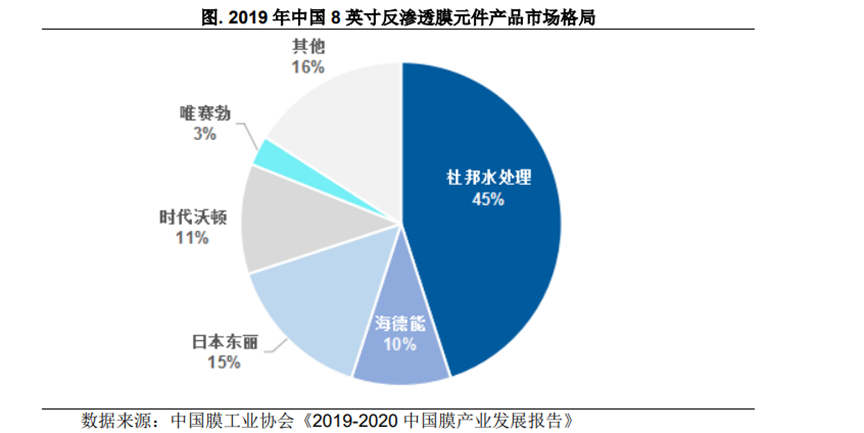同上述企业相比,国内公司在资金规模、技术储备、行业经验以及品牌知名度等方面仍存在一定差距。2019年唯赛勃8英寸反渗透膜的市场占有率仅3%。