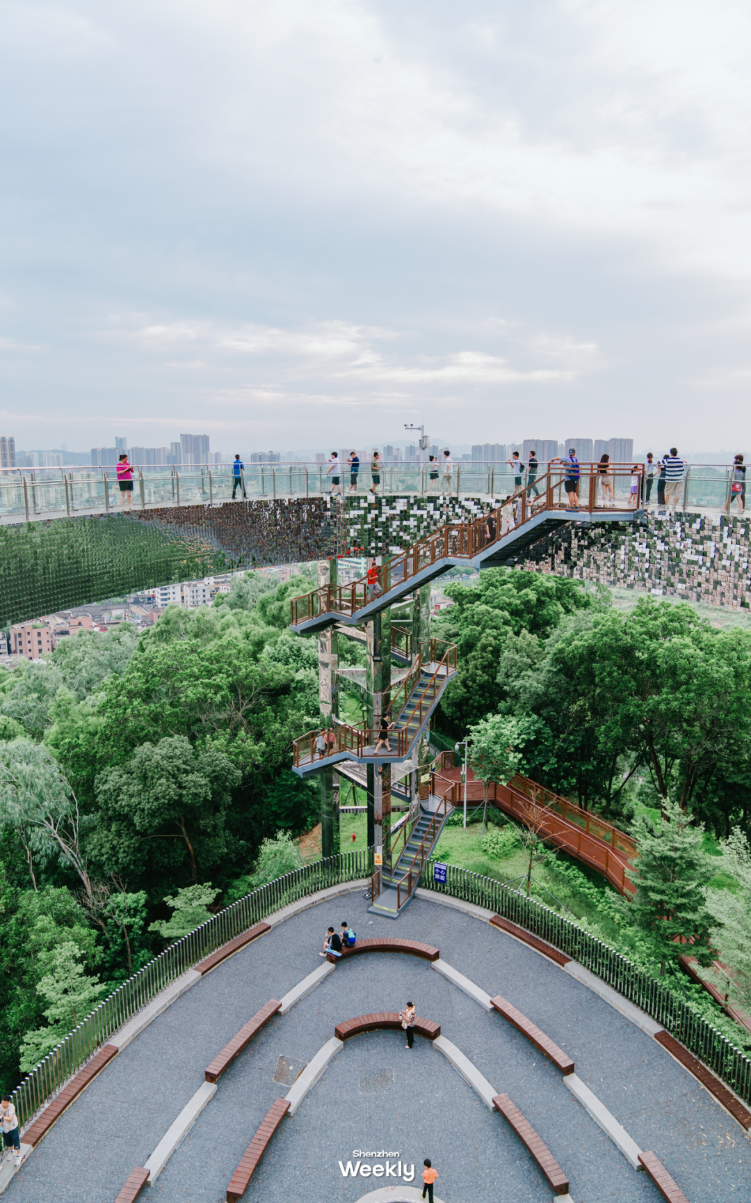 大鼓岭公园,有着由1w+枚“镜子”组成的8层楼高“天空之盾”,“镜子”实则为反光板风动装置,风吹时,环形廊桥上的镜片飘扬。