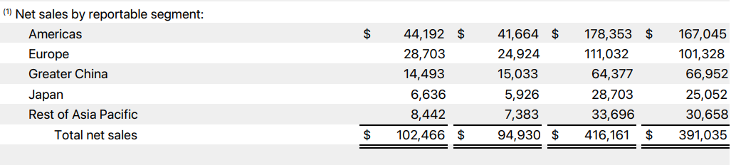 与之形成鲜明对比的是,大中华区成为了季度内苹果唯一收入下滑的市场。财报显示,期内大中华区的营收为144.93亿美元,较上年同期的150.33亿美元下降3.6%。