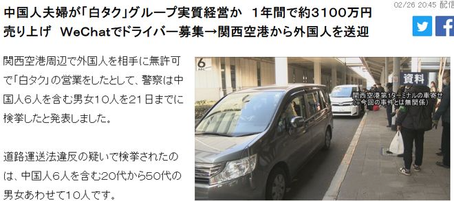 比如,今年2月底日本警方破获一起非法运营“黑车”案件,对包括6名中国籍人员在内的10名涉案嫌疑人进行立案调查。