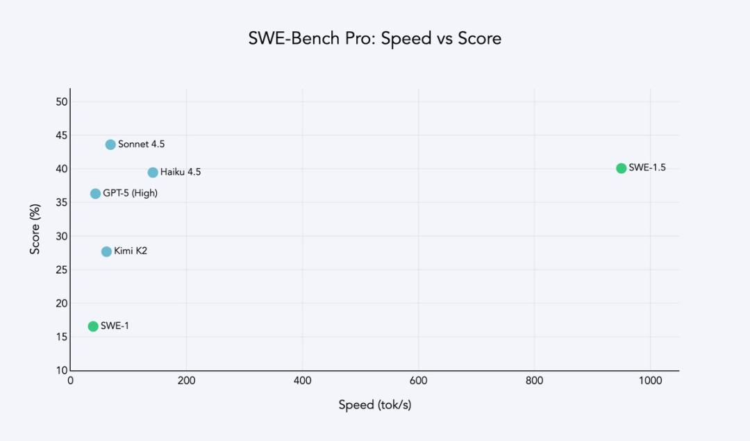 AI 编程独角兽 Cognition 近期也推出了他们最新的 AI 模型 SWE-1.5。这是一款快速智能体模型,参数量达到数千亿,编码性能接近 SOTA,速度也得到了显著提升——比 Haiku 4.5 快 6 倍,比 Sonnet 4.5 快 13 倍。