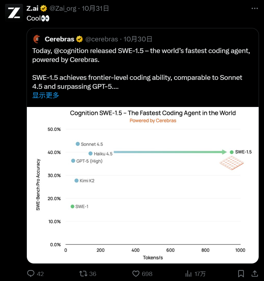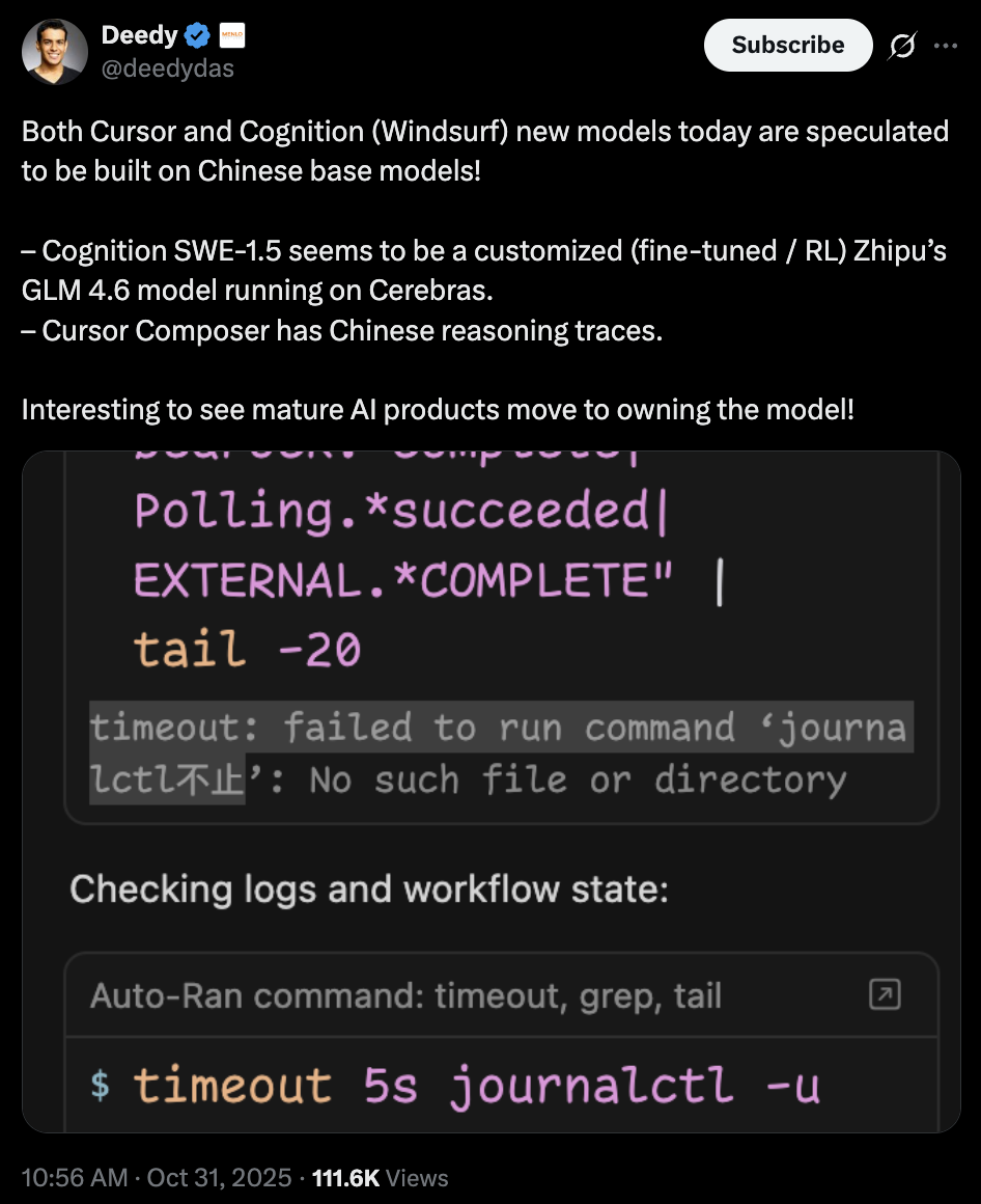 X 博主 @deedydas 认为,Cognition 的 SWE-1.5 基于中国公司智谱的 GLM 4.6 模型进行定制(精调 / 强化学习),并运行在 Cerebras 的硬件上;Cursor 的 Composer 模型也带有中国式推理痕迹。