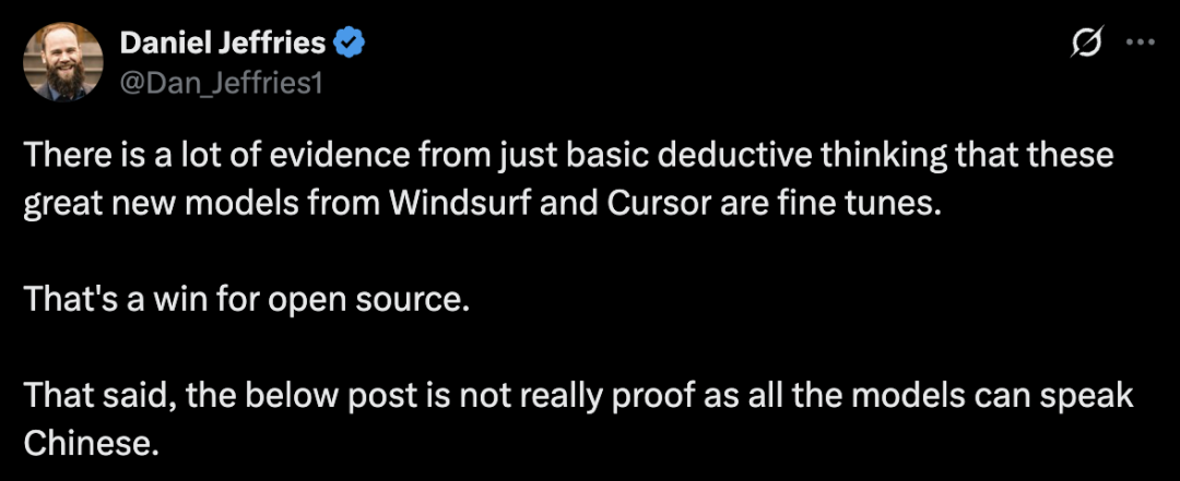 系统架构师 Daniel Jeffries 也发帖表示,有很多证据表明 WindSurf 和 Cursor 这些新模型都是经过微调,而不是从零开始训练的,这对开源社区来说是一个胜利。