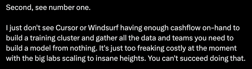 他还认为,Cursor 和 WindSurf 的团队并没有足够的资金来建设一个庞大的训练集群,也没有足够的数据和团队支持从零开始建立一个大模型。在当前,许多大型实验室已经在这一领域建立了强大的规模,单靠独立开发是无法成功的。