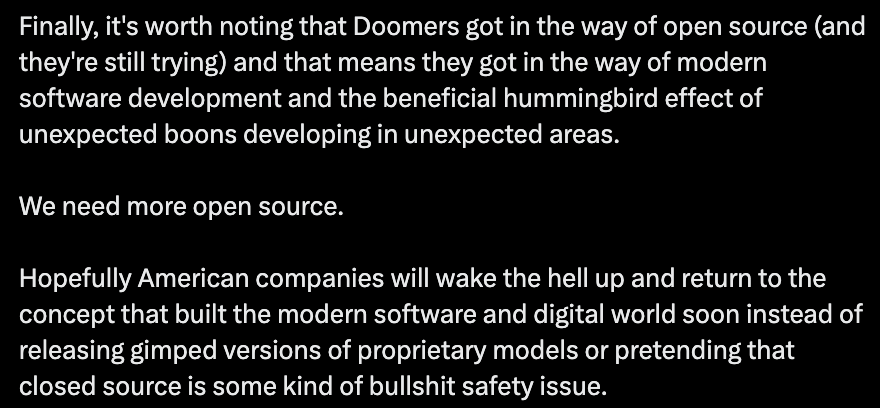 此外,他还指出,一些反对开源的公司和个人阻碍了开源模型的发展,影响了现代软件开发和创新的进程。他呼吁美国公司意识到开源的重要性,回归开源理念,而不是发布功能受限的专有模型。
