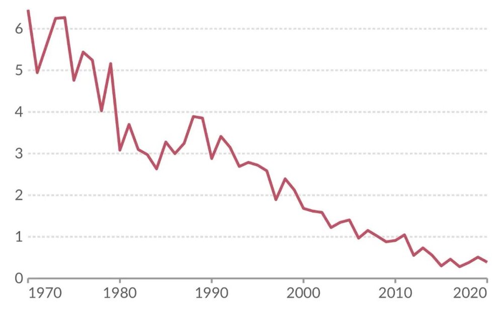 但是也不是从一开始就这样的。民航诞生到今天已经100多年了,过去坐飞机比今天要危险得多。比如我们看世界银行和航空安全网的一个数据统计:这是全球民航14座及以上客机——也就是包含了大部分民航客机——它们百万次飞行的死亡人数。