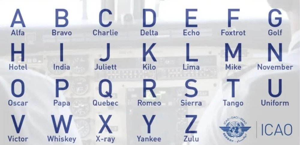 上世纪50年代,世界民航组织向全球的航空从业者推广了这一套字母表。我们来看一下:Alpha, Bravo, Charlie, Delta, Echo, Foxtrot, Golf, Hotel, India, Juliet, Kilo……都是用一些大家很容易读出来、又不是那么常用的一些单词来代替。